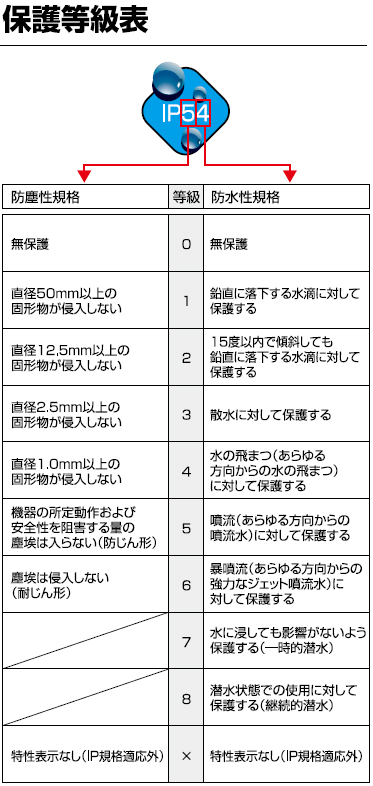 - IP=International Protectionの略で、「防塵性規格」「防水性規格」の等級を表しています。